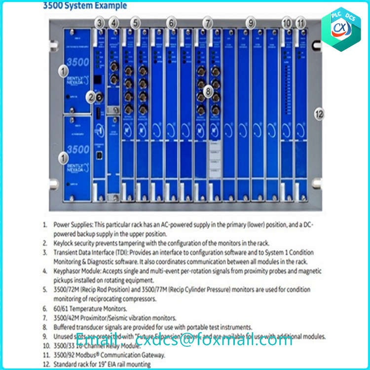 Modular Design: Mainframe (3300/05-22-00-00) with customizable insertable modules. • Multi-Channel Monitoring: Simultaneous tracking of vibration, speed, and critical parameters. • Advanced Diagnostics: Real-time analysis, alarm generation for early issue detection. • Scalability: Add modules as monitoring needs evolve, adapting to changing plant requirements. • Technical Specifications: • Multiple Module Slots: Accommodates various insertable modules. • Backplane Connectivity: Facilitates seamless communication. • Power Supply Integration: May integrate a power supply, eliminating external sources.