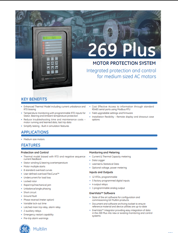The 269-100P-120 is a Multilin motor management relay manufactured by GE. The 269-100P-120 is designed for integrated control and protection for medium-sized AC motors. The 269-100P-120 reduces troubleshooting and maintenance costs, can be upgraded in the field, and simplifies testing procedures. It allows the user to access data through standard RS485 communications using Modbus RTU.