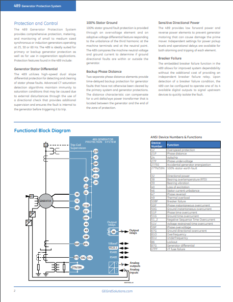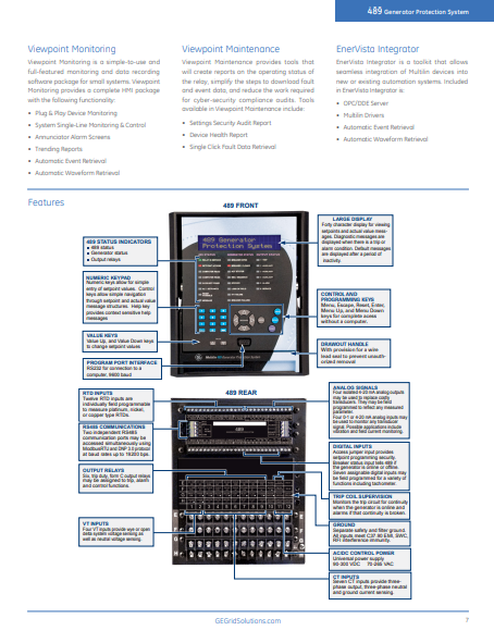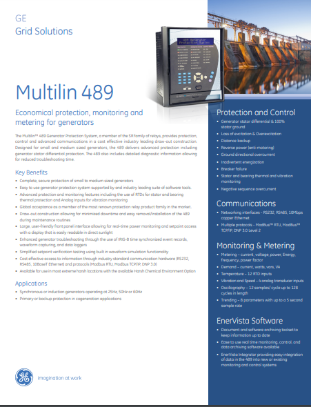 As part of GE’s SR family of relays, the 489-P1-LO-A20-E offers cost-effective protection and control packaged with advanced communications. This unit is designed to pair with small to medium-sized generators to give protection and to reduce troubleshooting time. The unit is easy to use and offers analog inputs for vibration monitoring along with RTDs for bearing thermal protection.